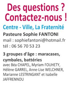 Notre journée débutera à 10h30 par un culte-autrement dynamique et participatif, séance éveil biblique pendant le culte, puis les enfants déjeunerons ensemble avec un repas tiré des sacs et ensuite, les enfants partiront pour vivre leur séance dans les différents groupes et ateliers jusqu’à 16h environ.