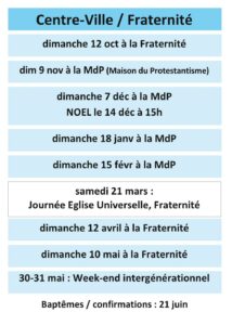 Le KT a lieu le dimanche (et non plus le samedi), tantôt sur le site de la Fraternité (octobre, mars, avril, mai, juin) tantôt sur le site de la Maison du protestantisme (novembre, décembre, janvier, février).