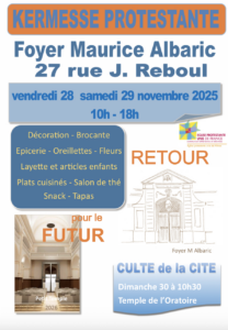 Les 28 et 29 novembre : Cette année la Kermesse de notre Eglise aura lieu exceptionnellement au Foyer Maurice Albaric, 27 rue Jean Reboul, du fait d’importants travaux se déroulant dans le Petit temple où elle se tient habituellement.