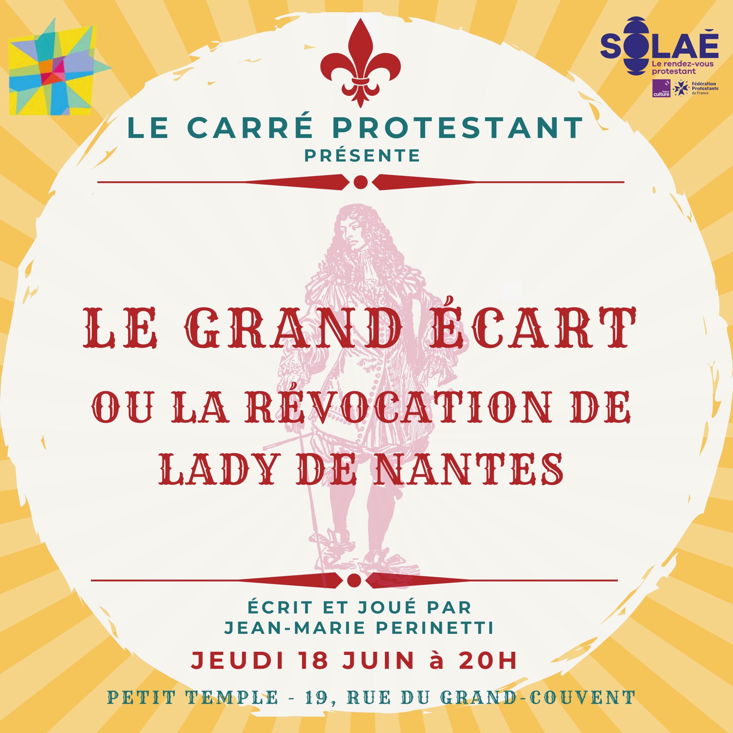 juin 18 @ 20 h 00 min - 21 h 30 min Théâtre – Le Grand écart ou la révocation de Lady de Nantes Petit Temple 19 rue du Grand Couvent, Nîmes, France